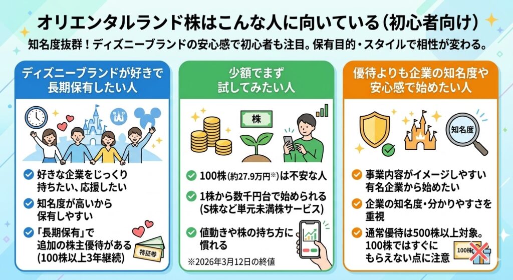 オリエンタルランド株は、知名度の高さやディズニーブランドの安心感から、株初心者にも注目されやすい銘柄です。ただし、どんな人にも一律で向いているというよりは、保有目的や投資スタイルによって相性が分かれます。